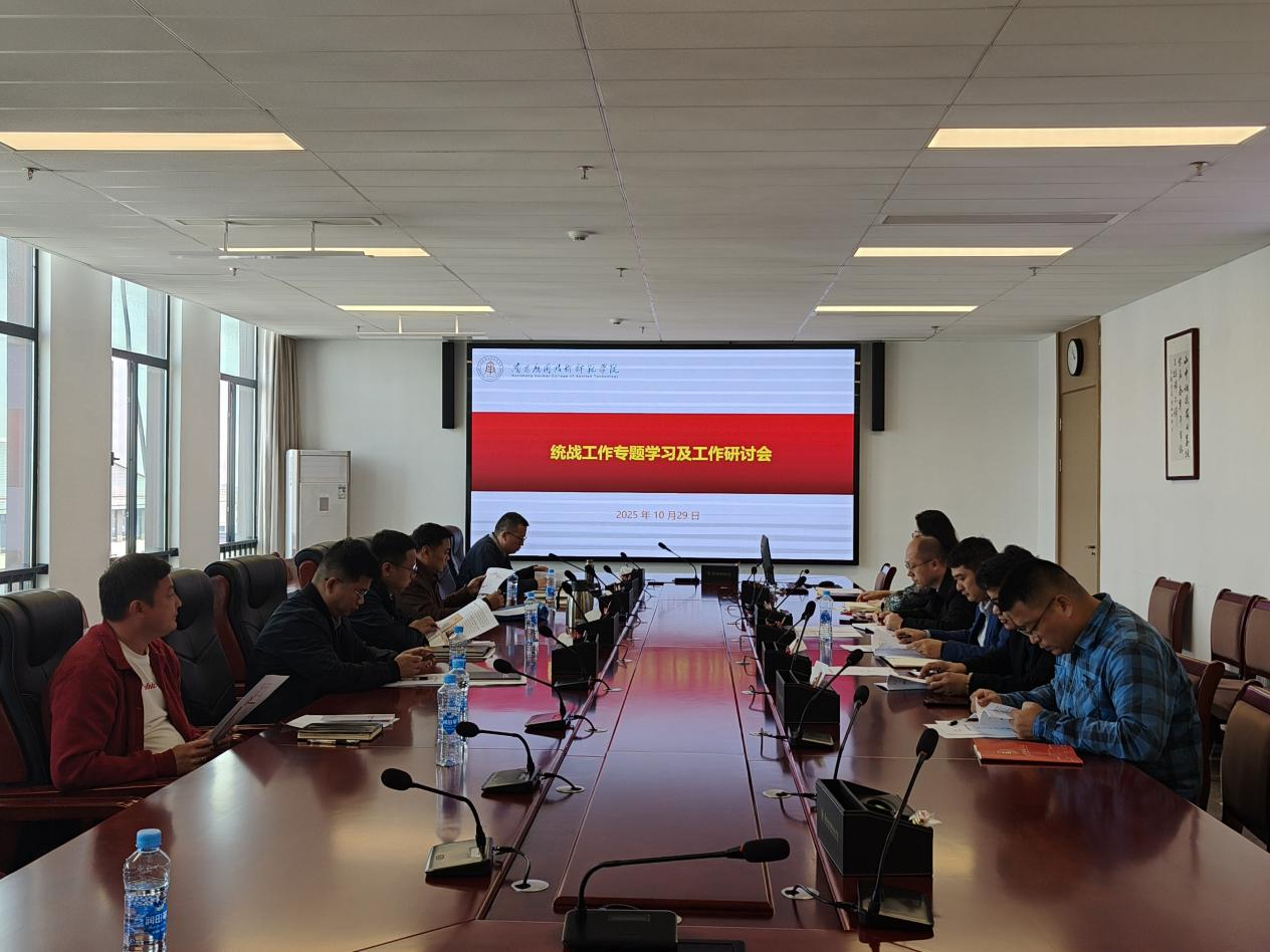 为深入学习贯彻习近平总书记关于做好新时代党的统一战线工作的重要思想,全面落实上级部门统战工作部署要求,10月29日上午,学校在致真楼503会议室召开新学期统战工作专题学习及工作研讨会。校党委委员、统战部部长许亮主持会议,党委宣传部、学工处、保卫处、校团委等职能部门负责人及各二级学院党委(党总支)书记参加会议。 会议学习传达了上级有关文件精神,与会人员集体研读习近平总书记重要文章《中华民族共同体的形成和发展是人心所向、大势所趋、历史必然》,重点领会“铸牢中华民族共同体意识”的核心要义,并结合习近平总书记在中共中央政治局第二十二次集体学习时关于“做好新时代党的统一战线工作”的重要讲话精神开展专题研讨;会上还开展了专题培训。就推进新学期统战工作重点任务落地落实,许亮解读了学校民族宗教工作“114”工作模式核心内涵,为新学期统战工作的精准施策提供指导,与会人员结合实际开展交流研讨。会议强调,要以此次会议为契机,持续深化理论学习、细化工作举措、实化育人成效,通过思想碰撞与责任压实,凝聚了“大统战”工作合力,为学校高质量发展凝聚最广泛的统战力量。(文图审/党委统战部)