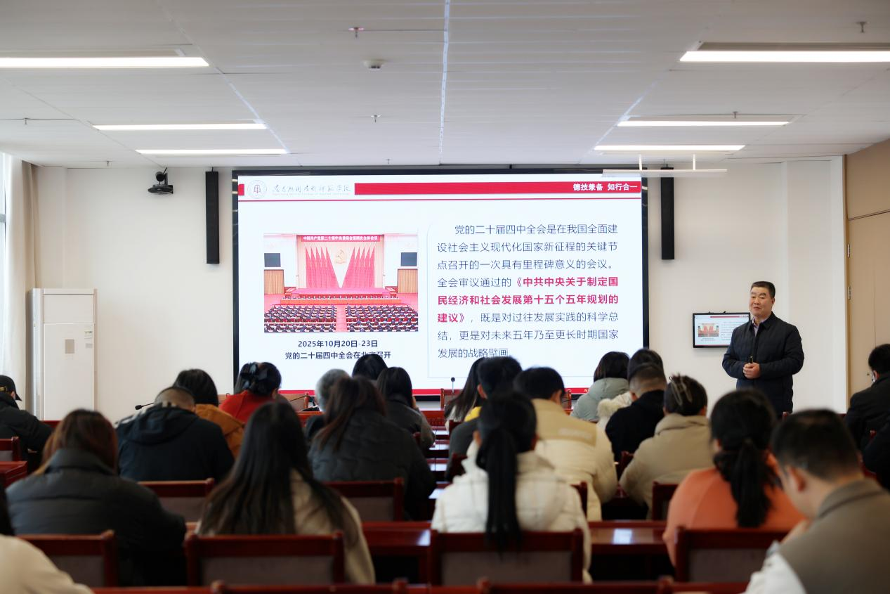 为深入学习宣传贯彻党的二十届四中全会精神,切实把思想和行动统一到党中央决策部署上来,12月16日,机关党委特邀马克思主义学院赵长胜教授作专题宣讲,深入解读党的二十届四中全会精神,机关全体党员干部参加。 赵长胜教授以深厚的理论功底和清晰的逻辑脉络,围绕党的二十届四中全会的核心概况、重大历史意义与核心要义解读三个方面进行了系统阐述,详细介绍了全会召开的时代背景与主要议程,重点解读了全会审议通过的《中共中央关于制定国民经济和社会发展第十五个五年规划的建议》。本次宣讲让机关党员干部对全会精神有了更直观、更深刻的理解。大家纷纷表示,将把学习成果转化为履职尽责的具体行动,对标对表深谋实干,为推动全会精神落地见效贡献智慧和力量。 (供稿/机关党委 校审/李慧朱蕾郑行忠)
