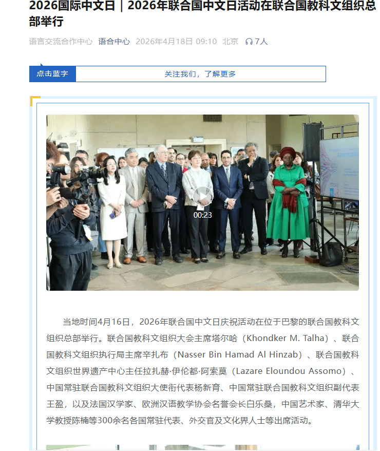 时值联合国正式将中文列为官方语言八十周年,亦逢第十七个联合国中文日。塞纳河畔,春光正好;巴黎城内,文脉流芳。2026年4月13日至17日,校长陶也青率队,携“字融匠心,艺见中国”工艺美术作品展亮相巴黎联合国教科文组织总部,为国际舞台注入浓郁的中国风韵。语言交流合作中心予以报道: https://mp.weixin.qq.com/s/w8LBHQzy3LnNdOxCAUT9Vg