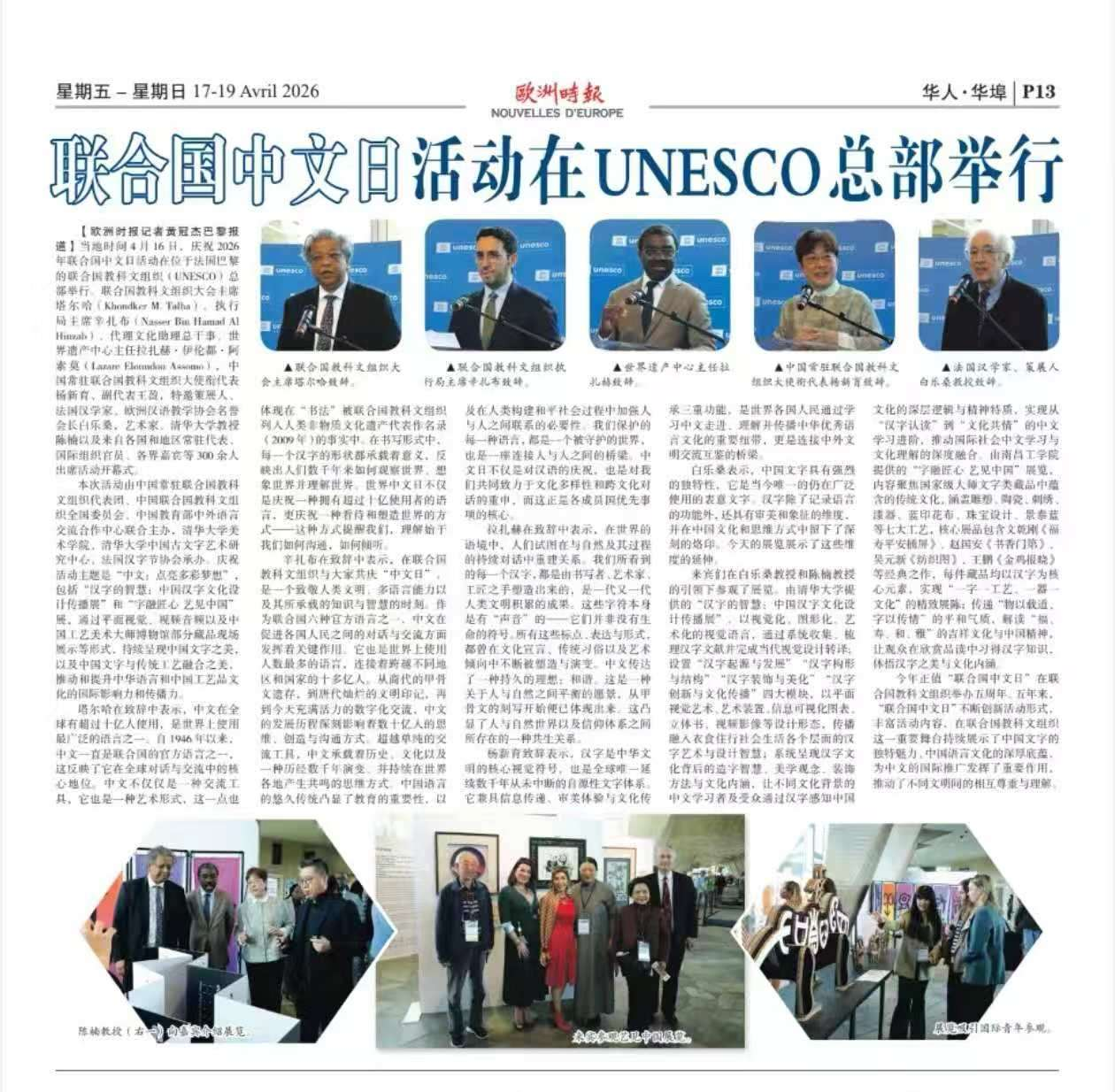 时值联合国正式将中文列为官方语言八十周年,亦逢第十七个联合国中文日。塞纳河畔,春光正好;巴黎城内,文脉流芳。2026年4月13日至17日,校长陶也青率队,携“字融匠心,艺见中国”工艺美术作品展亮相巴黎联合国教科文组织总部,为国际舞台注入浓郁的中国风韵。《欧洲时报》予以报道: