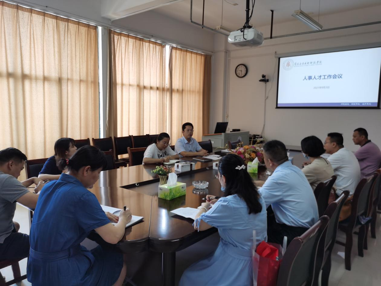 2021年9月3日上午,我校在行政楼220会议室召开人事人才工作会议。会议由校长助理郑行忠主持,各二级学院院长、书记及人力资源部出席会议。