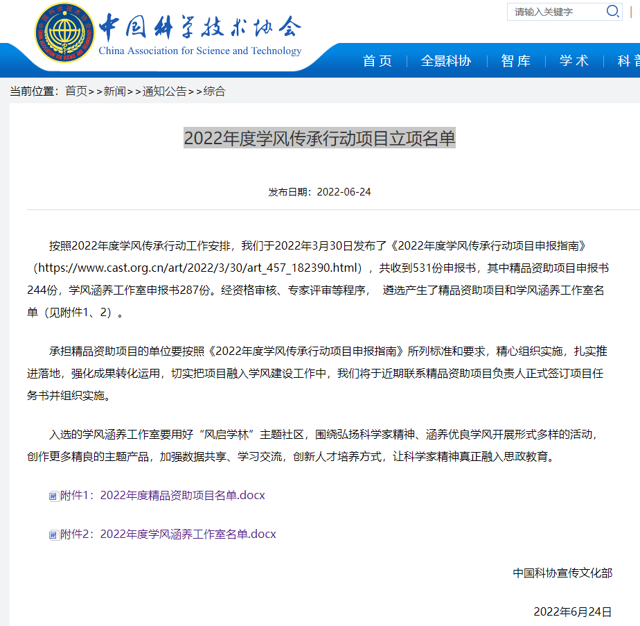 2022年度中国科学技术协会学风传承行动项目申报工作是根据中国科协、教育部、共青团中央、中国科学院、中国工程院等五部门联合印发《关于联合开展2022年“共和国的脊梁——科学大师名校宣传工程”》的工作安排,面向高校和科研院所开展学风建设资助计划,旨在深入学习贯彻习近平新时代中国特色社会主义思想,弘扬科学家精神,涵养优良学风,培养德智体美劳全面发展的栋梁之才。