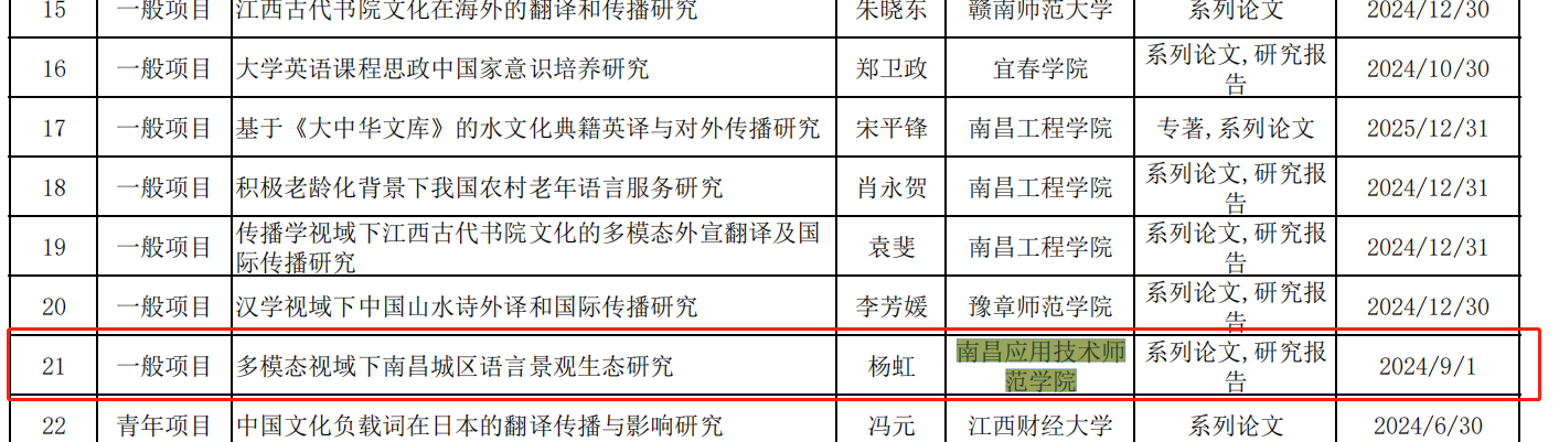江西省社会科学规划办公室公布了2022年江西省社会科学基金立项项目,我校杨虹老师主持的《多模态视域下南昌城区语言景观生态研究》喜获立项,是我校首次获得江西省社科基金项目立项。江西省社科基金项目是目前省级社会科学研究领域层次较高权威性较强、竞争较为激烈的项目,对全省的社科研究具有重要的示范和引导作用。此次我校实现了在该类项目立项的突破,充分展现了学校社会科学科研核心竞争力的提升。
