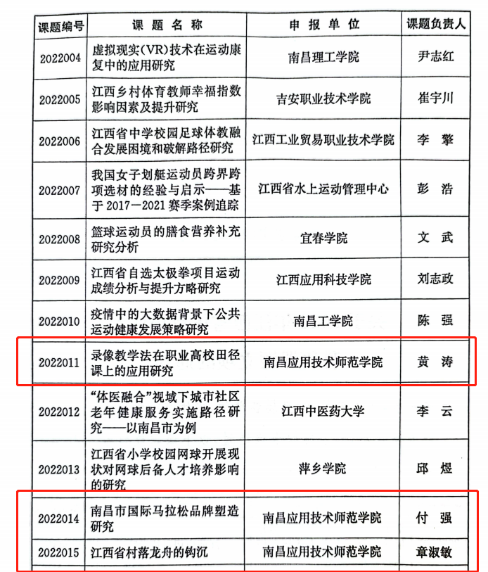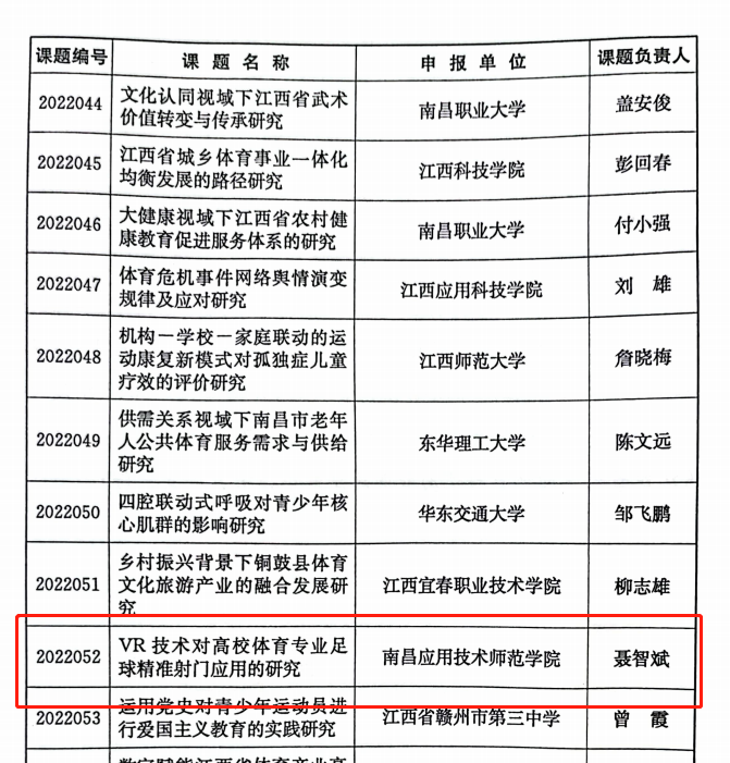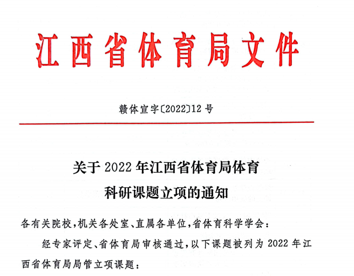 江西省体育局办公室公布了《关于2022年江西省体育局体育科研课题立项的通知》(赣体宣字〔2022〕12号),我校共获批4项,立项数量创新高。学校向来高度重视教师科研创新工作,以及艺术与体育学院大力支持与组织体育教师从事各级各类体育学科科学研究与申报工作,本次立项创历史新高,是主办方对我校体育教师科研工作能力的肯定,也是学校体育教师队伍科研工作能力培养建设的重要体现。