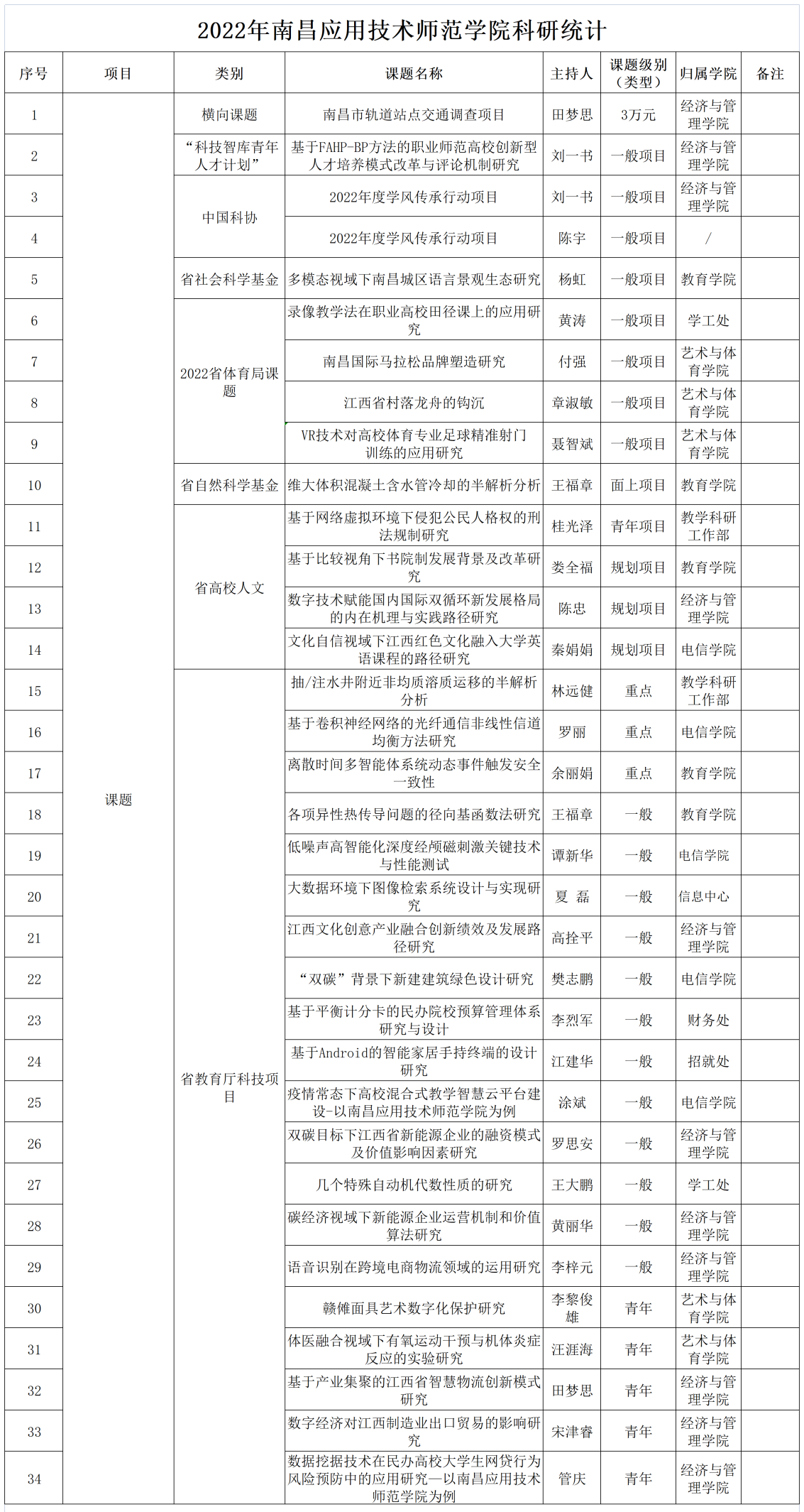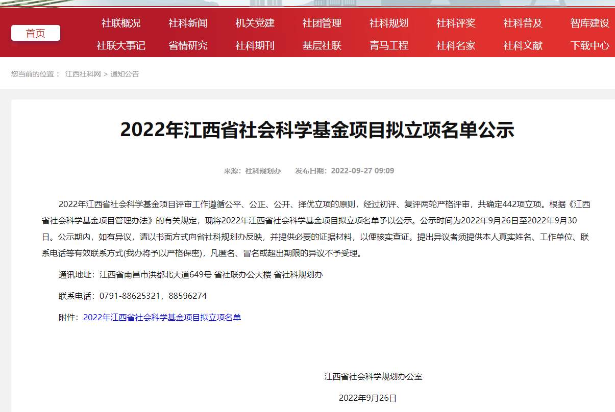 2022年度江西省高校人文社会科学研究项目立项评审结果公示,我校4个项目喜获立项,其中青年项目1项、规划项目3项。江西省高校人文社会科学研究项目是省教育厅面向全省普通高等学校设立的人文社会科学研究项目,为全省人文社科领域高级别的纵向科研项目,覆盖面广、影响力大,也是衡量高校人文社科科研水平的重要指标之一。此次课题成功立项是学校持续营造良好人文社科研究与发展环境,积极实施多形式科研激励等举措的成果。学校科研处将严格按照有关规定和要求,加强对立项项目的管理与指导,督促项目组提高研究质量和水平,并将以此为契机不断优化学术环境和科研管理机制,力争在高水平项目上再创佳绩。