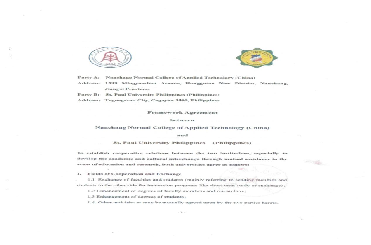 为进一步提高我校国际化办学水平,拓宽师生国际视野,2022年我校与菲律宾圣保罗大学签署了国际科研交易合作协议。此次国际合作两校将在科研合作、教师学历提升、学生学历提升、交换生、专业人员海外培训、联合学位项目等方面开展友好深入的交流,双方将本着平等互利的原则,以国际本科课程、硕士课程、博士课程的合作为基础,逐步深入推进双方的合作范围和内容。