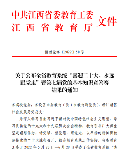 在中共江西省委教育工委、江西省教育厅主办的全省教育系统“喜迎二十大,永远跟党走”暨第七届党的基本知识竞答赛中,我校荣获优秀组织奖!此次竞答赛校党委高度重视、精心部署,由党委组织部牵头,在各二级学院党总支、机关各支部积极配合下,将党的基本知识教育在全校走深走实,教育引导广大师生学党史、听党话、感党恩、跟党走。