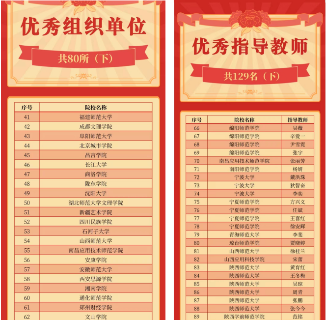 第四届全国师范生微课大赛获奖名单揭晓,我校9项作品获奖,其中特等奖1项、一等奖2项、二等奖6项。此外,南昌应用技术师范学院荣获优秀组织奖,我校教育学院张丽芳老师荣获优秀指导老师奖。