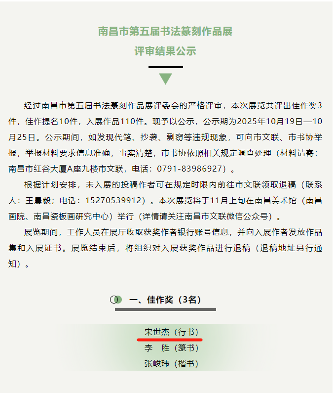 据悉,本次南昌市第五届书法篆刻作品展,经评委会严格评审,从入展作品110件中,共评出佳作奖3件,佳作提名10件。