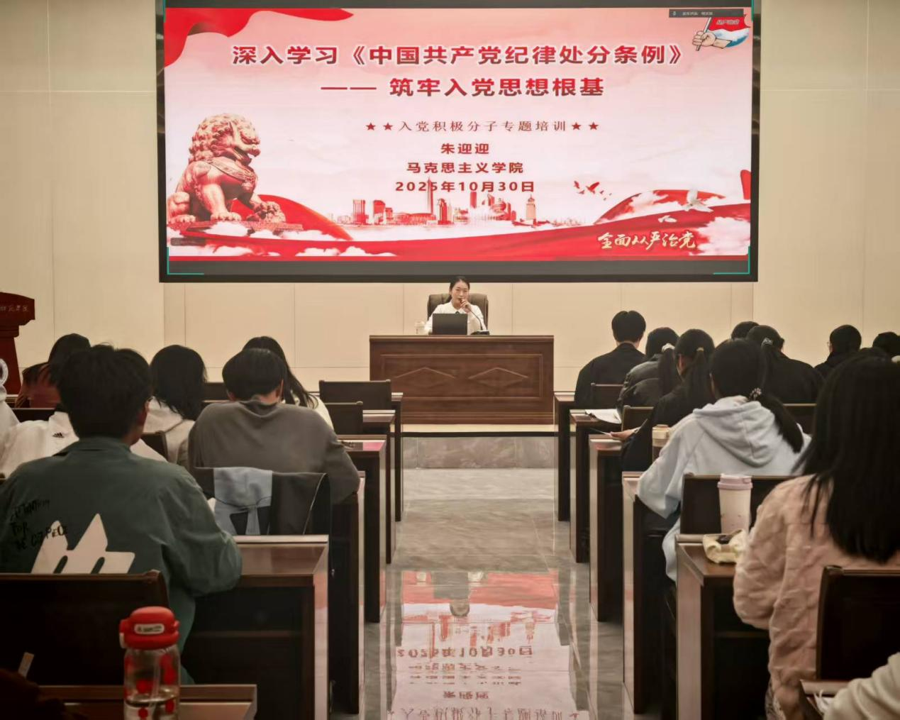 马克思主义学院教师朱迎迎就《中国共产党纪律处分条例》作专题报告,告诫学员们要树牢纪律与规矩意识,时刻做到心有所畏、言有所戒、行有所止,筑牢廉洁自律的思想防线。