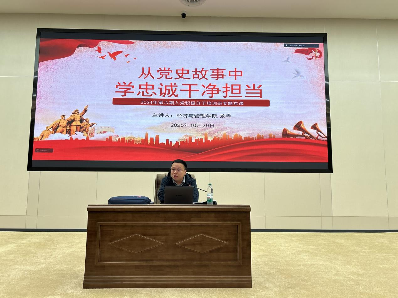 经济与管理学院党总支书记龙犇以《从党史故事中学忠诚干净担当》为题授课,勉励学员们从党史故事中汲取养分,将英雄先辈的精神特质内化于心、外化于行,在日常学习工作中锤炼品格、勇担责任。