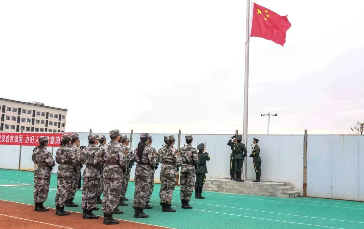 迎着初升的朝阳,伴着雄壮的国歌声,鲜艳的五星红旗冉冉升起,全体师生肃立注目,进行这场庄重的升旗仪式。