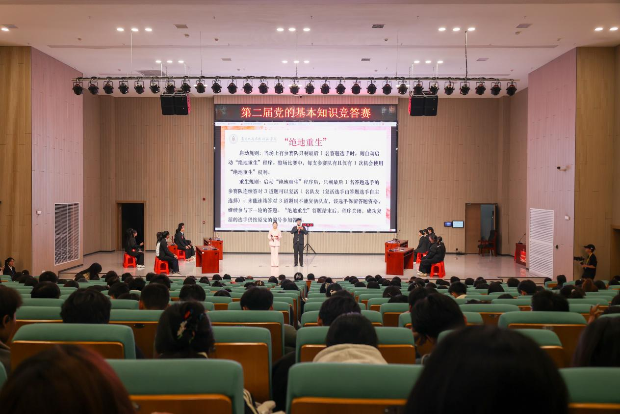 12月2日下午,学校第二届党的基本知识竞答赛在图书馆报告厅举行,比赛由学校党委主办,党委组织部、教育学院承办。校党委委员、副校长郑行忠,校党委委员、纪委书记、组织部部长杨冬,各二级党组织负责人,党委宣传部负责人出席并为获奖单位颁奖。各党支部书记、组织员、党员代表、入党积极分子代表等近400人观看比赛。