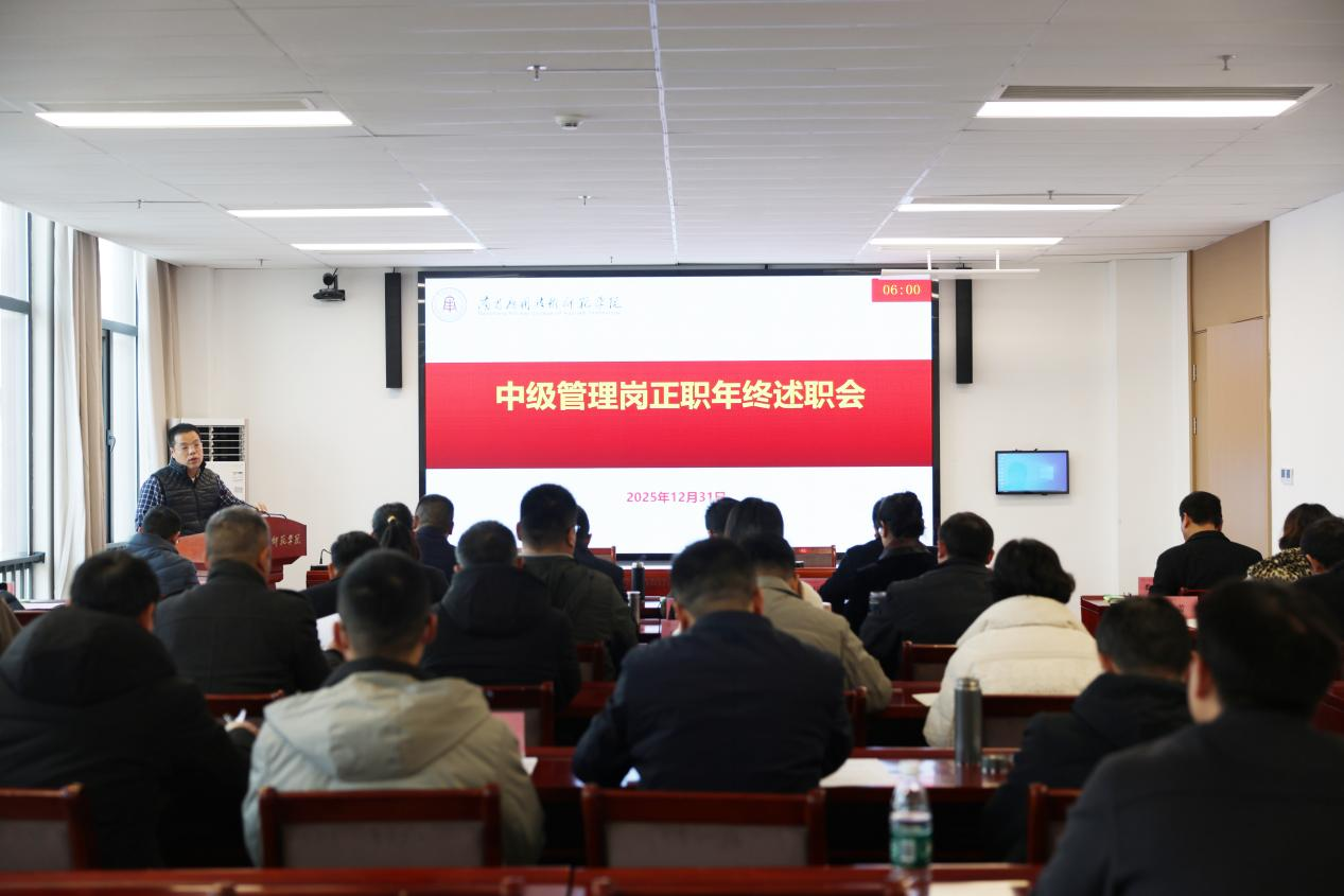 12月31日上午,学校在致真楼第七会议室召开中级管理岗正职2025年终述职会。校党委书记、督导专员胡晓娥,校长陶也青以及全体在家校领导参加会议。会议由杨冬主持,参加述职会的还有各职能部门负责人、二级学院院长、书记。
