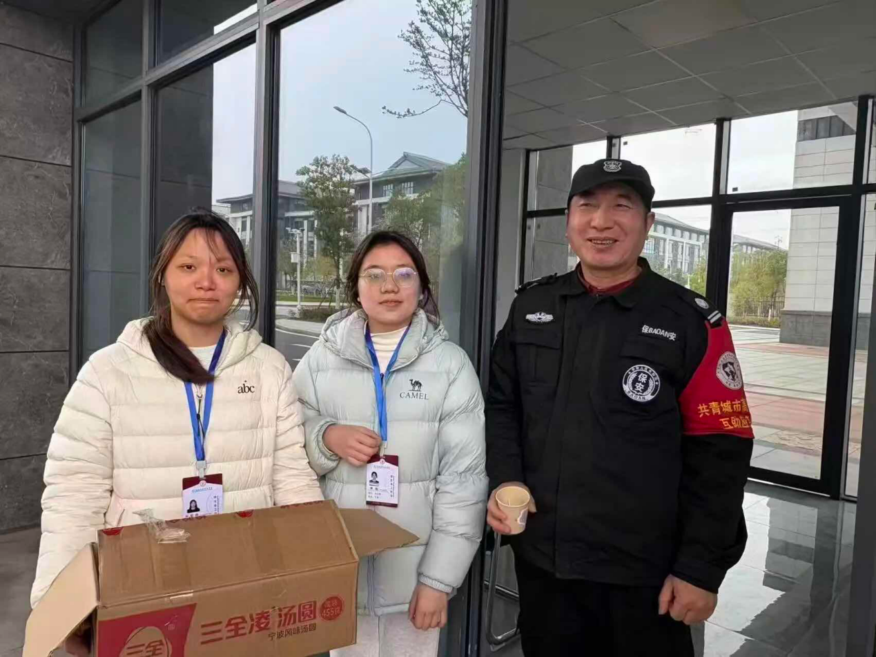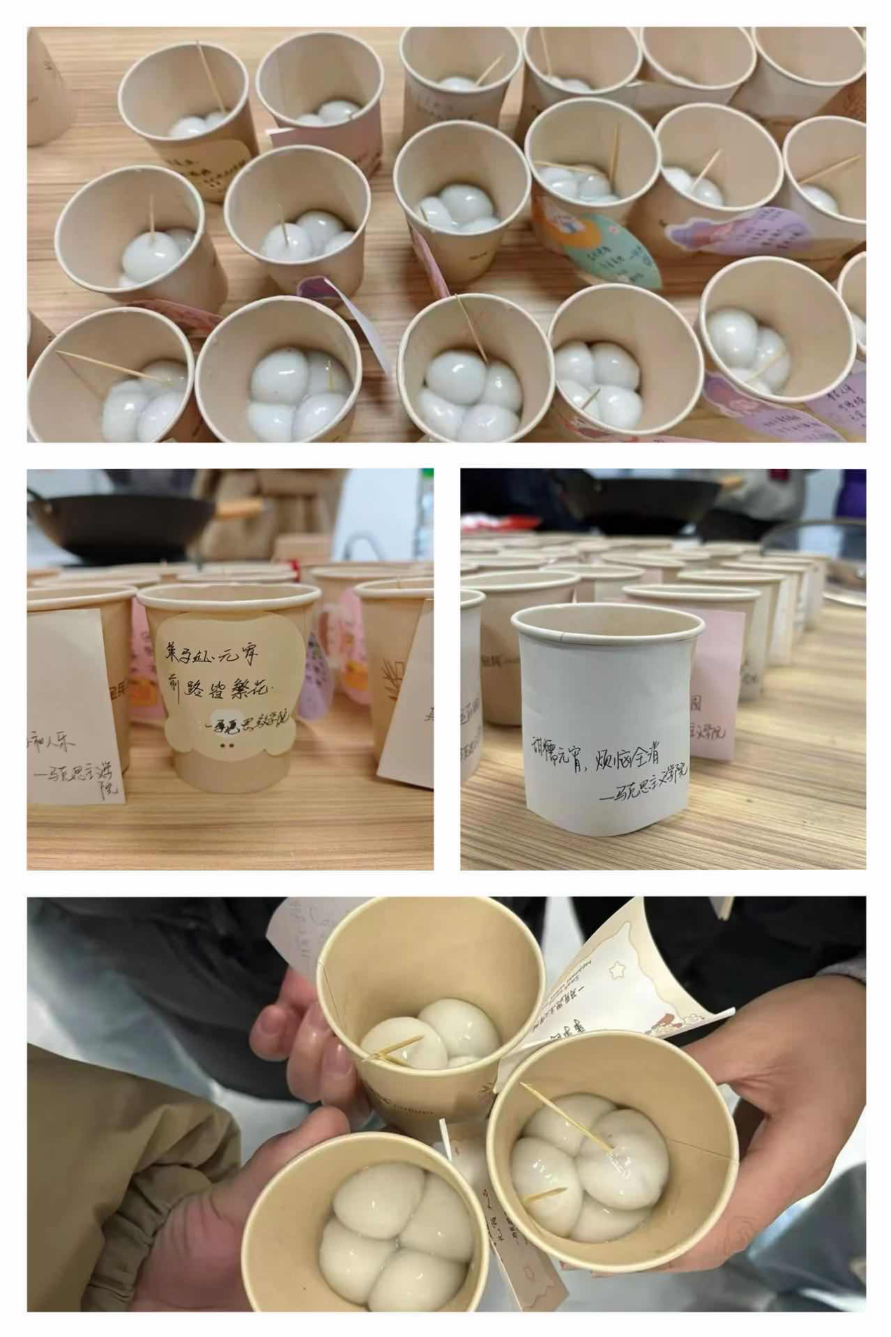 以上图为:学校志愿者为师生送汤圆、送关怀