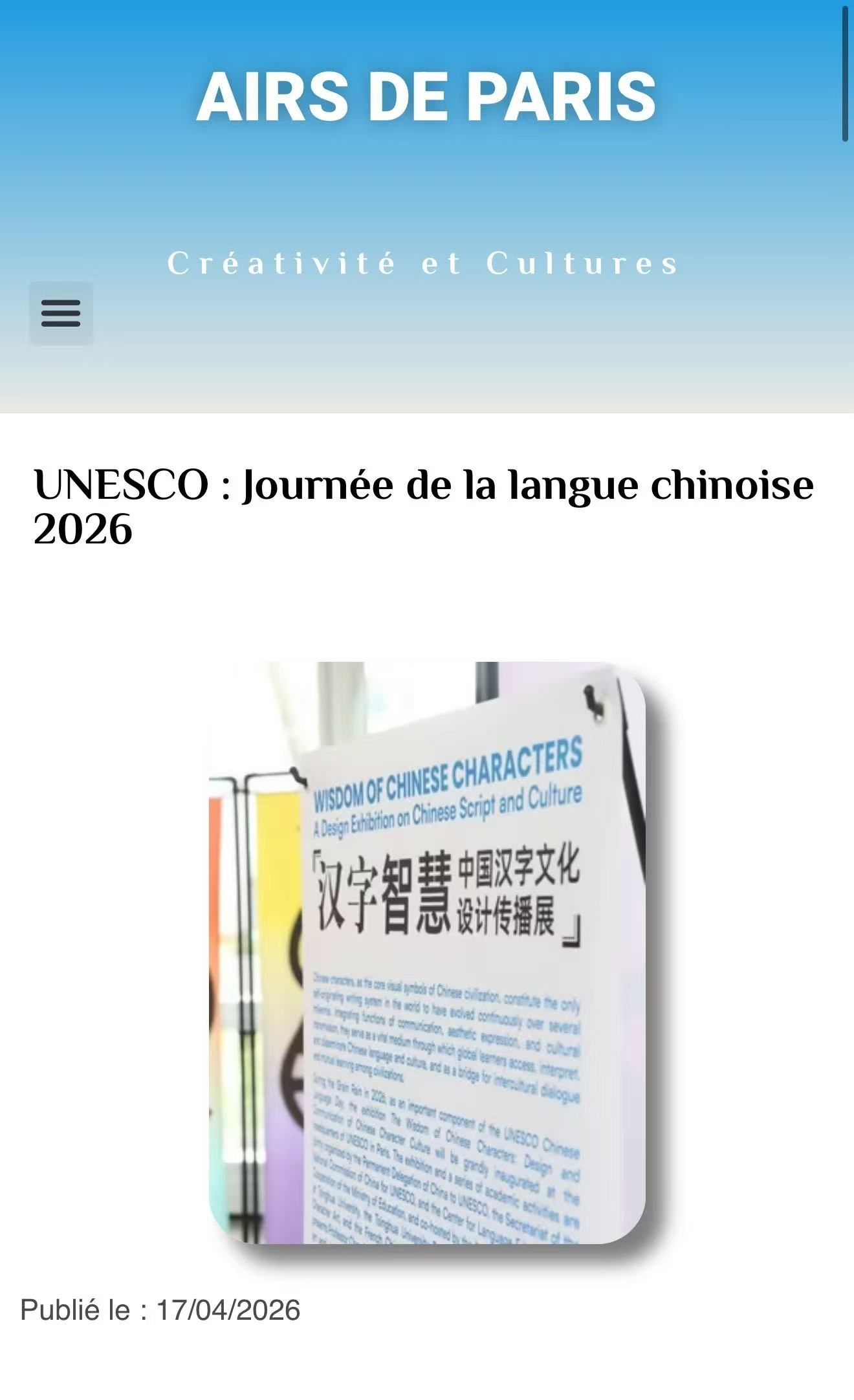 首页栏目 校园传真 学校新闻 通知公告 校园映象 院部动态 媒体关注 信息公开 专题网站 您现在的位置是:首页 > 首页栏目 > 院部动态 《巴黎灵感》报道我校闪耀联合国中文日 2026-04-27 文章作者: 浏览次数:71 时值联合国正式将中文列为官方语言八十周年,亦逢第十七个联合国中文日。塞纳河畔,春光正好;巴黎城内,文脉流芳。2026年4月13日至17日,校长陶也青率队,携“字融匠心,艺见中国”工艺美术作品展亮相巴黎联合国教科文组织总部,为国际舞台注入浓郁的中国风韵。《巴黎灵感》予以报道: 上一篇 《法国中文电视》报道我校闪耀联合国中文日 下一篇 《欧洲时报》报道我校闪耀联合国中文日